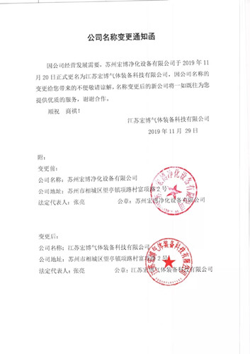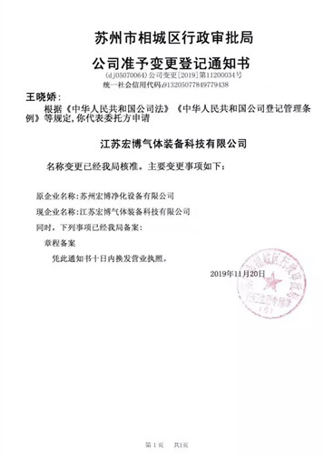 為適應(yīng)市場經(jīng)營和公司發(fā)展需要,2019年11月20日,經(jīng)蘇州市相城區(qū)行政審批局核準,原“蘇州宏博凈化設(shè)備有限公司”正式變更登記為“江蘇宏博氣體裝備科技有限公司”。